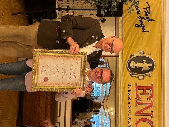 Am Jubiläumsabend im Harzer Schnitzelhaus übergab Herr Wilhelm Fach die Urkunde zur 20-jährigen Zusammenarbeit an Familie Faupel